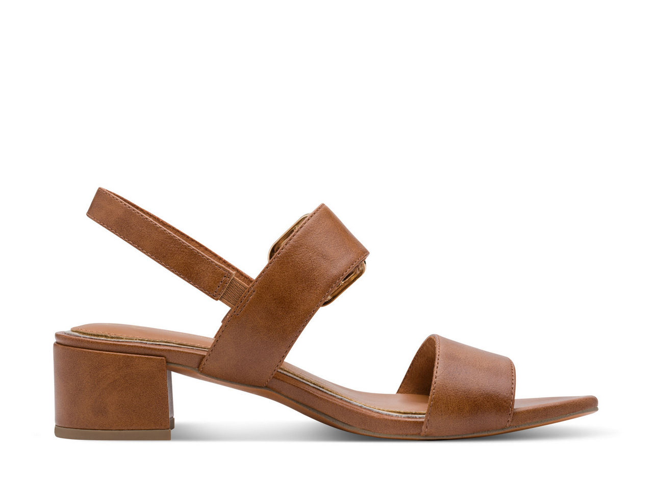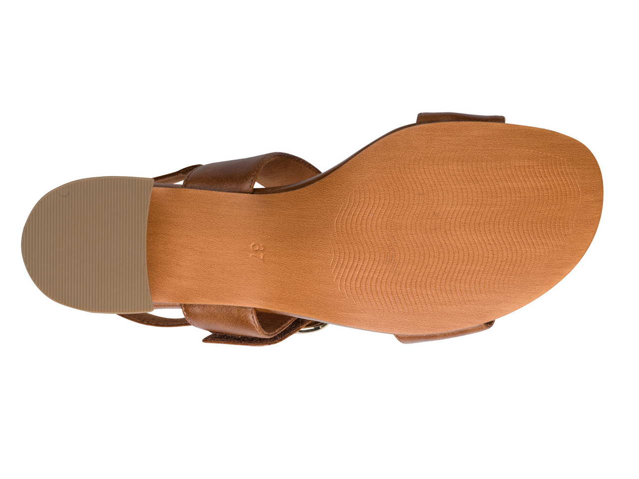 Brun sandalett i syntet med låg klack. Remmen stängs med hjälp av ett kardborr-spänne.
