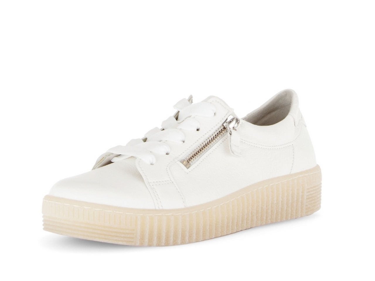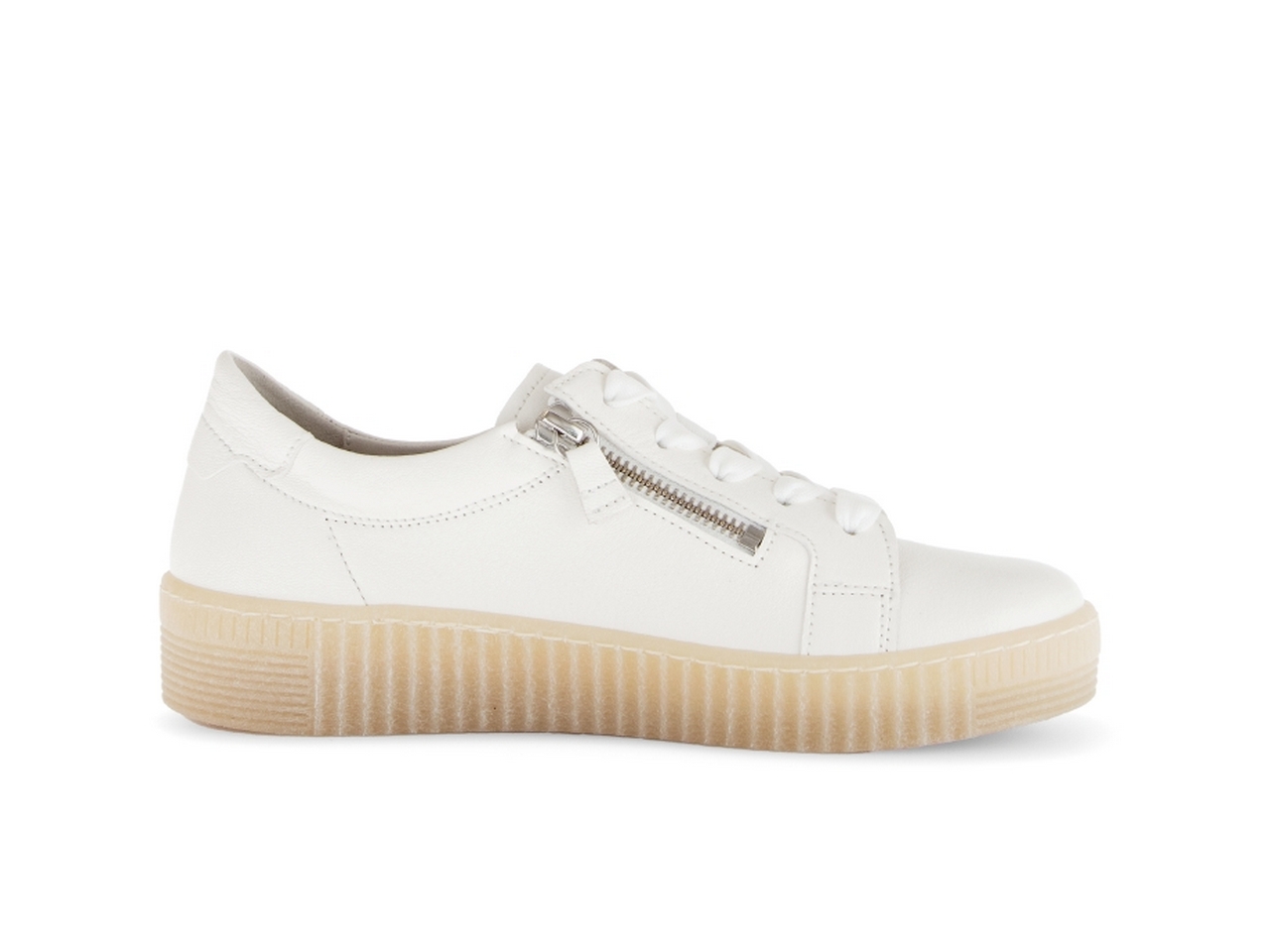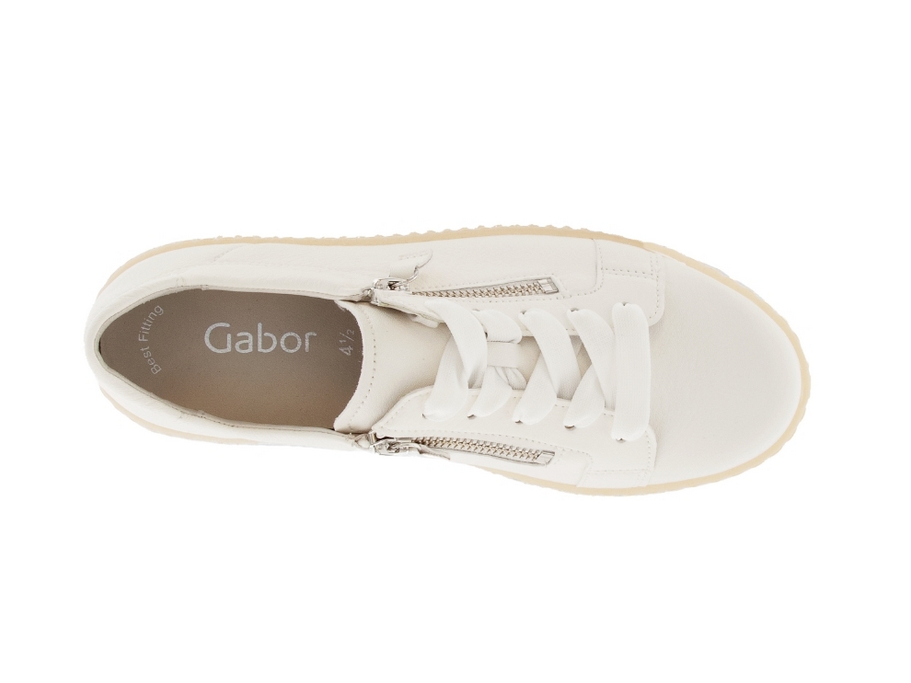 Stilren vit snakers i mjukt läder från Gabor med en uttagbar innersula. Kombinationen av dubbla dragkedjor och snörning gör det enkelt att kliva i och ur skorna enkelt och ger samtidigt möjligheten att anpassa skon efter din egen vrist.